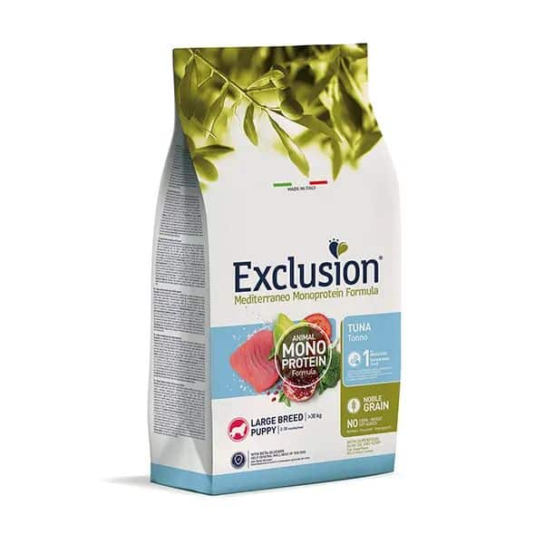 „Exclusion Mediterraneo Puppy Tuna Large Breed“ – aukštos kokybės sausas maistas šuniukams, sukurtas specialiai didelių veislių augintinių augimui ir vystymuisi.